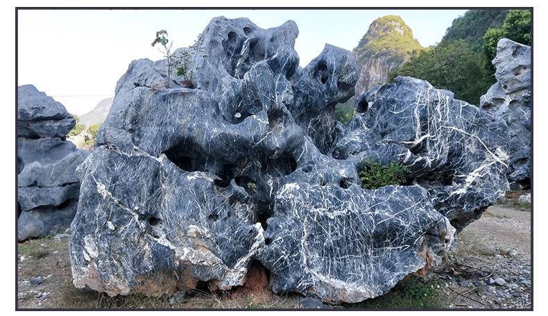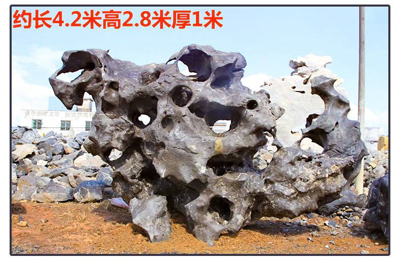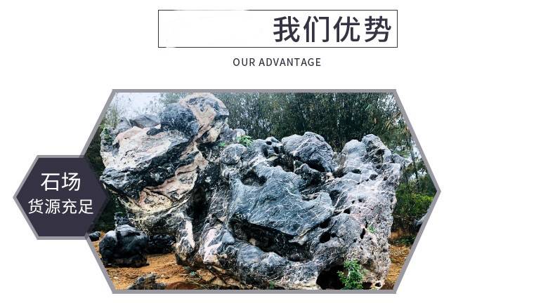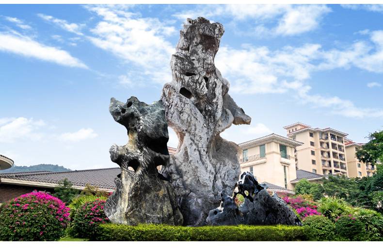江门天然独石太湖石原石大型园林假山 摆件庭院外景观石材 太湖石,又名窟窿石、假山石,是由石灰岩遭到长时间侵蚀后慢慢形成的,分有水石和干石两种。水石是在河湖中经水波荡涤,历久侵蚀而缓慢形成的。干石则是地质时期的石灰石在酸性红壤的历久侵蚀下而形成。形状各异,姿态万千,通灵剔透的太湖石,其色泽能体现"皱、漏、瘦、透"之美,其色泽以白石为多,青黑石、黄石。黄色的更为稀少,适宜布置公园,草坪,校园,庭院旅游景色等。有很高的观赏价值。 太湖石属于石灰岩,多为灰色,白色、黑色。石灰岩长期经受波浪的冲击以及含有二氧化碳的水的溶蚀,在漫长的岁月里,逐步形成大自然精雕细琢、曲折圆润的太湖石。太湖石为典型的传统供石之一,以造型取胜,多玲珑剔透、重峦叠嶂之姿,宜作园林石等。 太湖石可谓千姿百态,异彩纷呈:或形奇、或色艳、或纹美、或质佳、或玲珑剔透、灵秀飘逸;或浑穆古朴、凝重深沉,脱俗,令人赏心悦目。它不重复,一石一座巧构思,自然天成,是叠置假山,建造园林,美化生态,点缀环境的选择,且具有收藏价值,是一劳永逸的绿色工程。