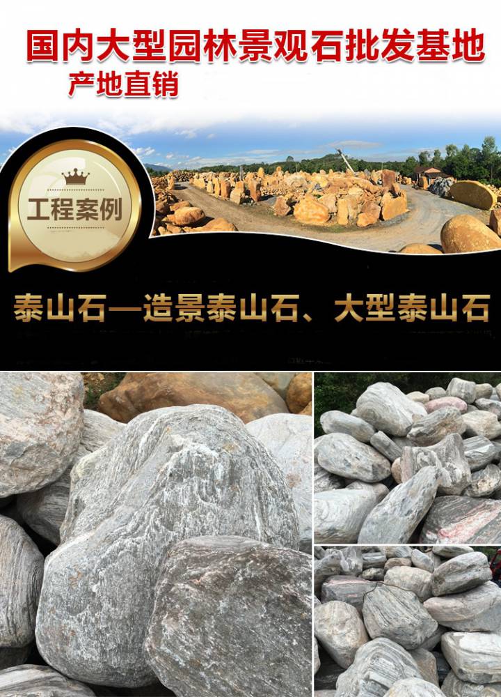 泰山石质地坚硬,结构细密,有的结晶颗粒较粗;形态为自然块体,古朴墩厚,呈次棱角形、浑园形,多见不规则卵形,以显示图纹为主;基调沉稳、凝重、浑厚,多以渗透、半渗透的纹理画面出现。在灰白、灰黑、灰绿、浅江、黛青、黄、褐、黑等颜色的石面上,交织着千姿百态的白色纹理,或凸或凹,构成高山流瀑、古木枯枝、飞禽走兽、人物等图案,且光润亮泽,构图均衡、清晰,各得其妙。色调多以黑白为主,有水墨画的清高淡雅,有的还巧妙地嵌入红或黄色的纹饰。 泰山石的岩石为斜长片麻岩、黑云母角闪斜长片麻岩、片麻状花岗岩、花岗片麻岩及细粒角闪石岩等。其图纹是晚期浅色矿物斜长石、钾长石、石英等充填于不规则的原生裂隙中结晶而成,有的是由于地质原因,被重熔的斜长石、石英等浅色矿物岩汁,上升充填在浅部岩石的裂隙中,形成多种网状、枝叉状、条带状、团块状等脉体。在地壳变动中,这些变质岩渐露地表,受漫长的自然风化后形成孤立块体,并崩落、滚入沟谷河道,经流水冲刷和砂石磨砺而成为奇石。 厂家直销泰山石园林景观工程用石庭院公园造景石品质货源