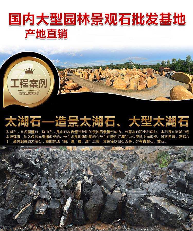 吨位太湖石假山鱼池驳岸石园林奇石 厂家批发价格美丽 太湖石,又名窟窿石、假山石,是由石灰岩遭到长时间侵蚀后慢慢形成的,分有水石和干石两种。水石是在河湖中经水波荡涤,历久侵蚀而缓慢形成的。干石则是地质时期的石灰石在酸性红壤的历久侵蚀下而形成。 太湖石属于石灰岩。多为灰色,白色、黑色。相对而言,石灰岩容易受到外来力量的侵蚀,比如长期经受波浪的冲击以及含有二氧化碳的水的溶蚀,软松的石质容易风化,比较坚硬的地方保存下来,这样在漫长岁月里,太湖石逐步在大自然条件下精雕细琢,逐渐形成了曲折圆润的形态。中国碳酸盐岩分布区很广,在适宜的构造、岩石和水文地质条件下,均可寻找和开发得用类似江苏的太湖石。 太湖石属于石灰岩,多为灰色,白色、黑色。石灰岩长期经受波浪的冲击以及含有二氧化碳的水的溶蚀,在漫长的岁月里,逐步形成大自然精雕细琢、曲折圆润的太湖石。太湖石为典型的传统供石之一,以造型取胜,多玲珑剔透、重峦叠嶂之姿,宜作园林石等。