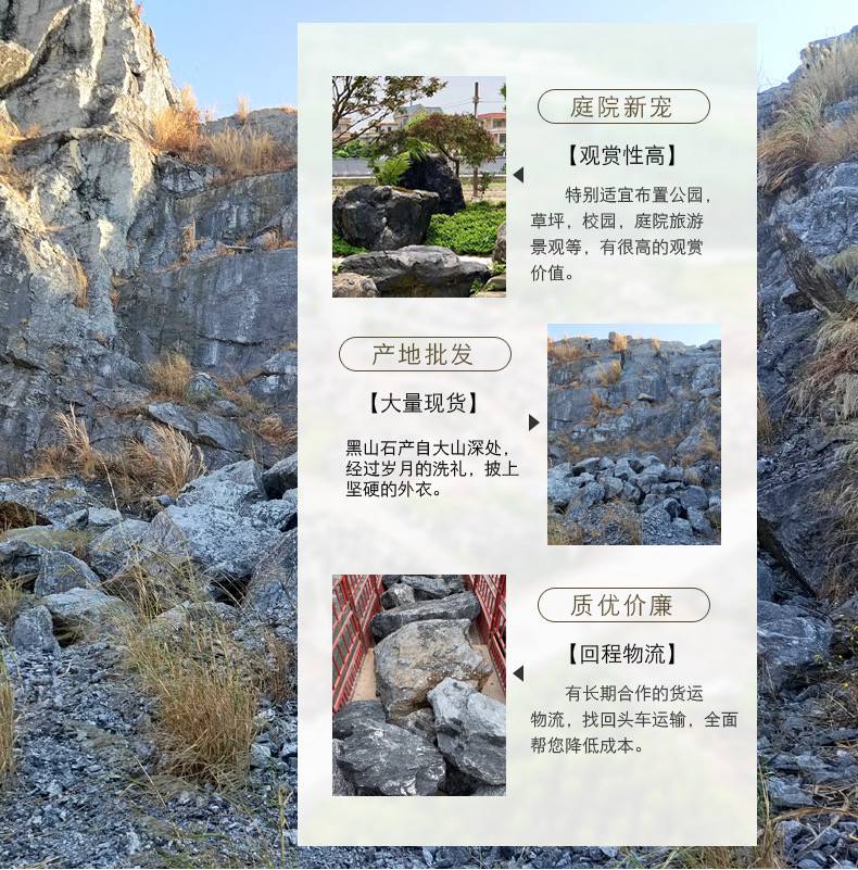 别墅黑山石日式枯山水黑色石头装饰造景石 黑山石是园林的布景石材,是园林石的一种,可谓千姿百态,异彩纷呈:或形奇、或色艳、或纹美、或质佳、或玲珑剔透、灵秀飘逸;或浑穆古朴、凝重深沉,脱俗,令人赏心悦目。它不重复,一石一座巧构思,自然天成,是叠置假山,建造园林,美化生态,点缀环境的选择,且具有收藏价值,是一劳永逸的绿色工程。 黑山石打造禅意庭院,黑山石伴你过禅意人生。景观石是园林景观中起到点缀、美化景观作用的自身具有美感的石头,也称为园林石、风景石、观赏石。景观石用途广,在景观设计中随处可见其身影,如广场,企业、草坪、公园如天井,草坪小径、泳池周围、栏杆、别墅地基、凉亭、门廊等周围。也可以做假山与河道、档墙。