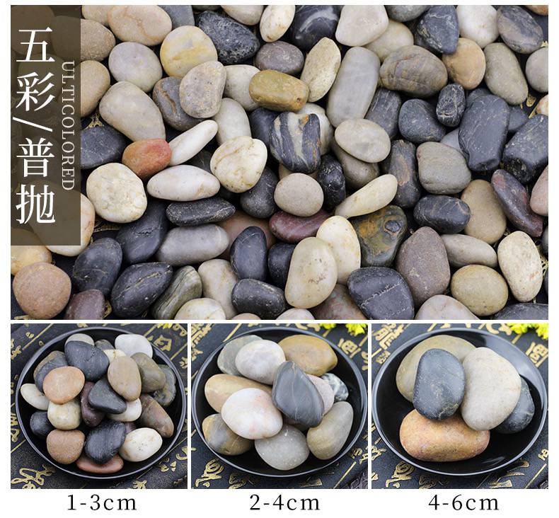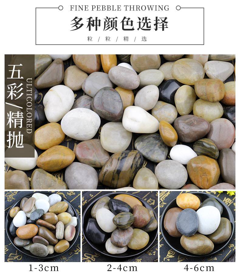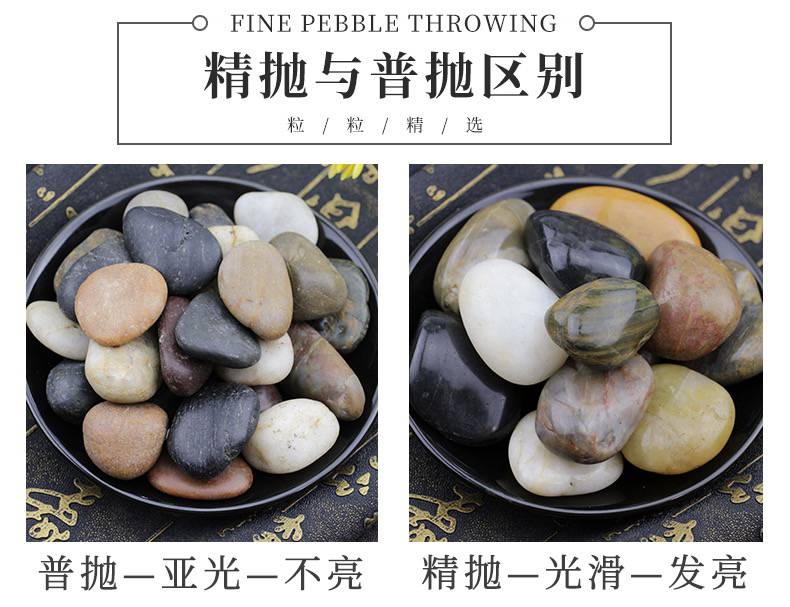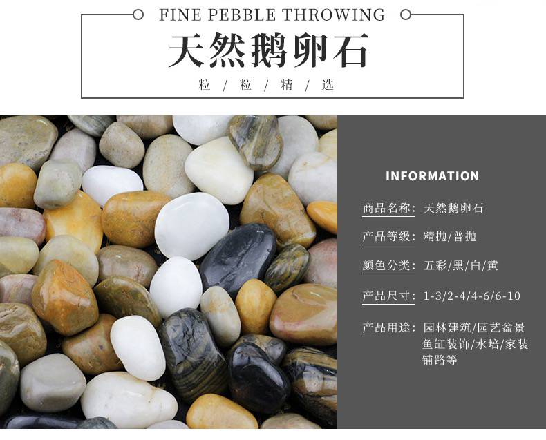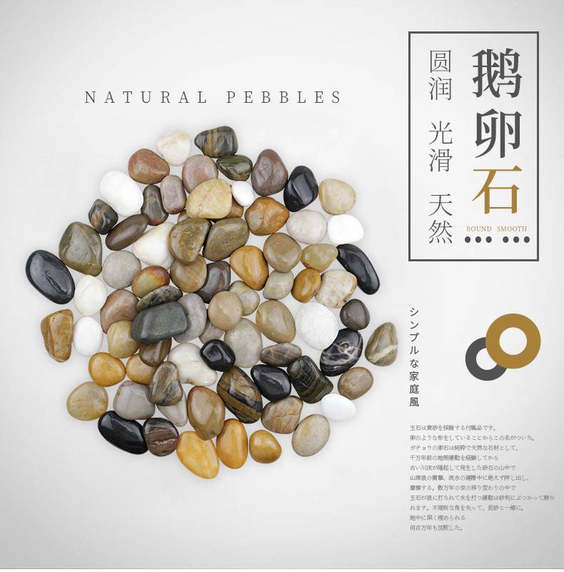 精抛鹅卵石铺路石雨花石小石子庭院装饰石 鹅卵石产品有:天然颜色的机制鹅卵石、河卵石、雨花石、干粘石、喷刷石、造景石、木化石、文化石、天然色理石米等建筑装饰材料及室内装饰用的染色沙、不脱色。品质坚硬,色泽鲜明古朴,具有抗压、耐腐蚀的天然石特性,是一种理想的绿色建筑材料。 鹅卵石,是开采黄沙的附产品,因为状似鹅卵而得名。鹅卵石作为一种天然的石材,取自经历过地壳运动后由古老河床隆起产生的砂石山中,经历着山洪冲击、流水搬运过程中不断的挤压、摩擦。在沧桑演变过程中,它们饱经浪打水冲的运动,被砾石碰撞磨擦失去了不规则的棱角,又和泥沙一道被深埋在地下沉默了下来。 鹅卵石是自然形成的无棱角岩石颗粒,可形成砾岩。分为河卵石、海卵石和山卵石。卵石的形状多为圆形,表面光滑,与水泥的黏结较差,拌制的混凝土拌合物流动性较好,但混凝土硬化后强度较低。
