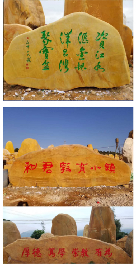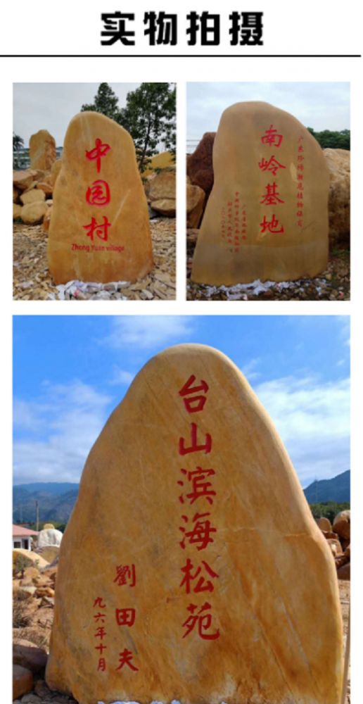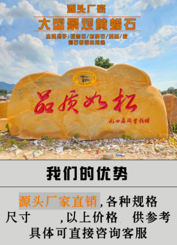 广州刻字石黄蜡石招牌路标石批发销售 黄蜡石属景观石、园林石的一种,是镌刻诗文、题写招牌的景观石,现广用作地产招牌石、广场题名石、路牌石、学校励志石、驳岸园林石等。其造型可分卧石和纵石两大类,颜色天然,加工工艺为打磨和刻字。 其天然富丽的外形、朴实的质感加上汉字书法有动感画意的有机结合,展现出一个欣欣向荣的发展气象。 大块黄蜡石属景观石、园林石的一种,是镌刻诗文、题写碑额的重要载体;放在小区、单位、工厂、企业门口做厂牌石,标志石等,而石的天然质朴的外形、质感和汉字书法有动感画意的线条的有机结合,本身就寓意了人力和自然的统一,利用景观石为景点置石,还可以为人们提供一个良好的休息、文化娱乐、亲近自然,人们回归自然愿望的场所。 我石场十几年来经过石场全体员工的不懈努力,工程案例已布满各地。主打产品有:大型景观石、大型黄蜡石、巨型刻字石、大型太湖石、水冲石、英石、鹅卵石、吨位黄蜡石、自然石、晚霞石、文化石、驳岸石、台面石、园林景观石等石材。不仅批发整石、散石,还承接市政园林绿化工程、小区街景、观景假山、风景景观石、空中花园,亭台搂阁、木屋、观赏鱼池等工程设计施工等.